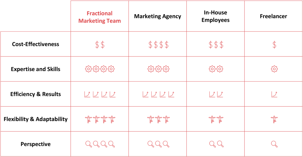Fractional Marketing Team is different, and ideal for clients seeking a flexible, customized solution that leverages a broad set of skills without the overhead of a full-time team.